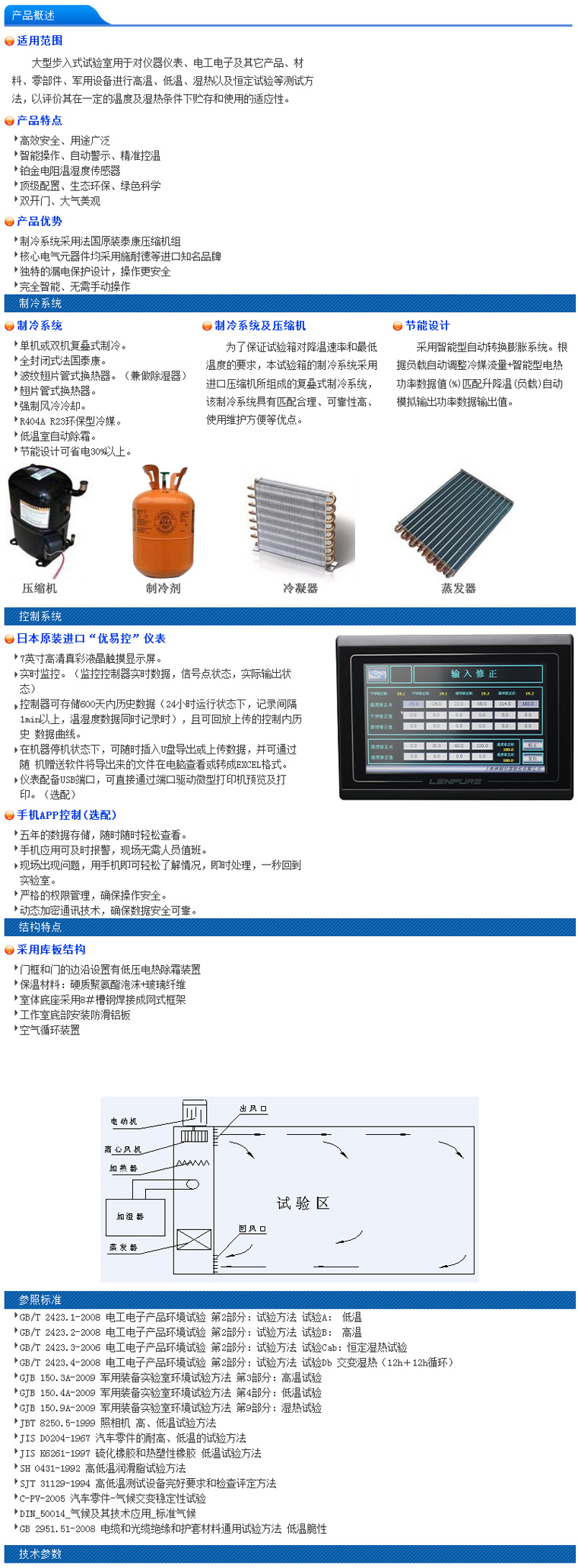 極寬的溫度控制范圍,可滿足GB/T2423《電工電子產(chǎn)品基本試驗規(guī)程》12、3、4項的試驗要求。